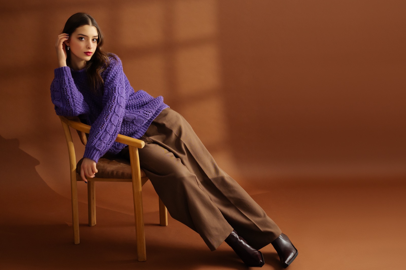 Lavendel und Schokoladenbraun kombinieren wirkt besonders in strukturierten Materialien wie Bouclé, Tweed und schwerem Strick harmonisch. Designer wie Chloé und Jil Sander präsentierten Layering-Looks, bei denen lavendelfarbene Oberteile mit schokoladenbraunen Hosen und Accessoires ergänzt wurden.