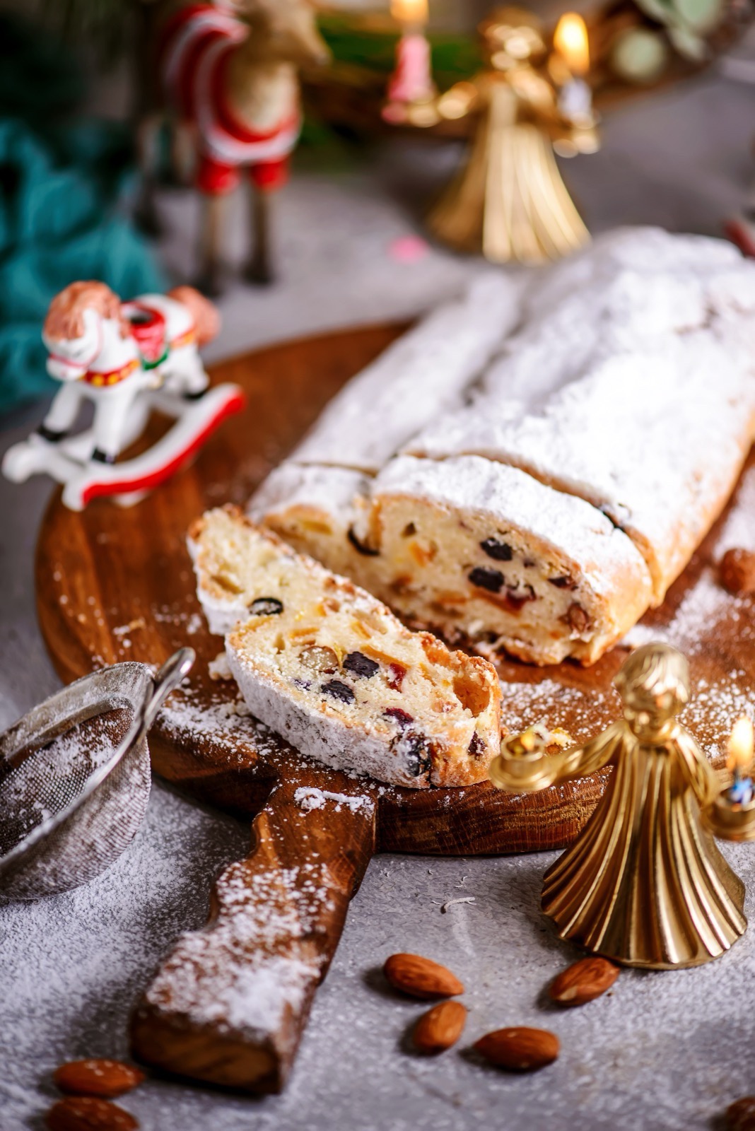 - Bestreichen und verzieren: Den warmen Stollen sofort nach dem Backen mit flüssiger Butter bestreichen und großzügig mit Puderzucker bestäuben. Diesen Vorgang nach dem Abkühlen wiederholen, um eine schöne Zuckerschicht zu erhalten.