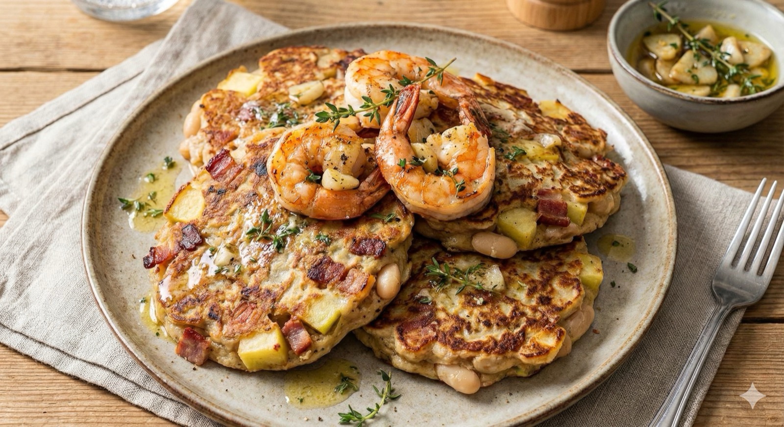 Raffinierte Kombination: Apfel-Bohnen-Speck-Pfannkuchen mit Garnelen