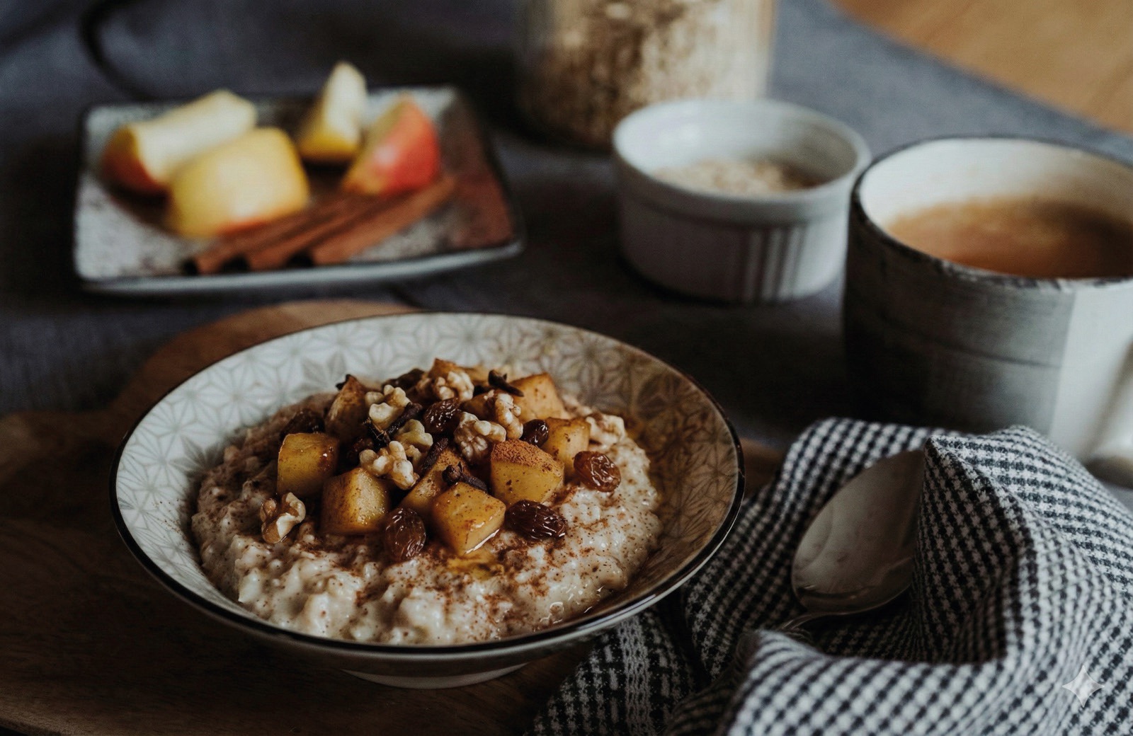 Bratapfel Porridge vereint das traditionelle Winterdessert mit einem gesunden Frühstück. Es ist der perfekte Start in einen kalten Wintertag und versorgt den Körper mit wichtigen Nährstoffen.