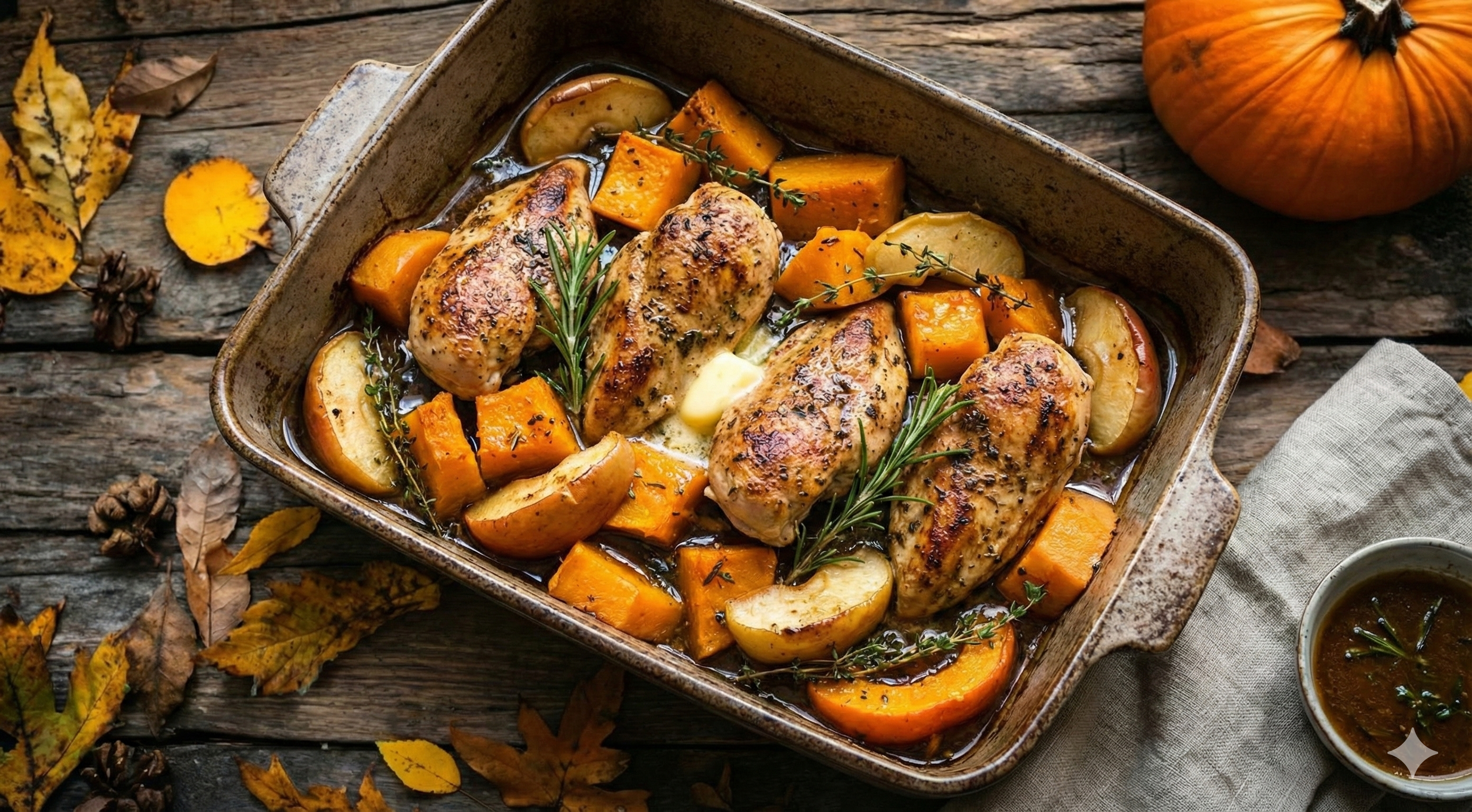 Die Kombination aus geschmortem Apfel und Kürbis mit zarter Hähnchenbrust ist ein aromatisches Wintergericht, das durch seine harmonischen Aromen überzeugt.
